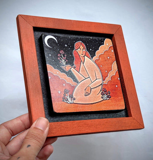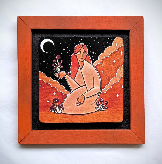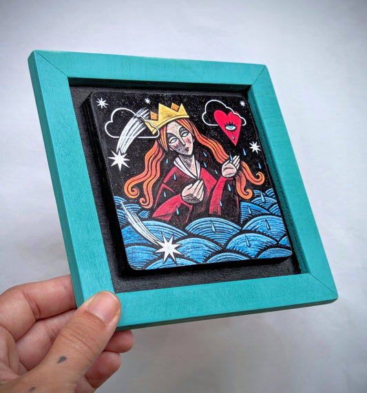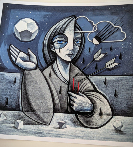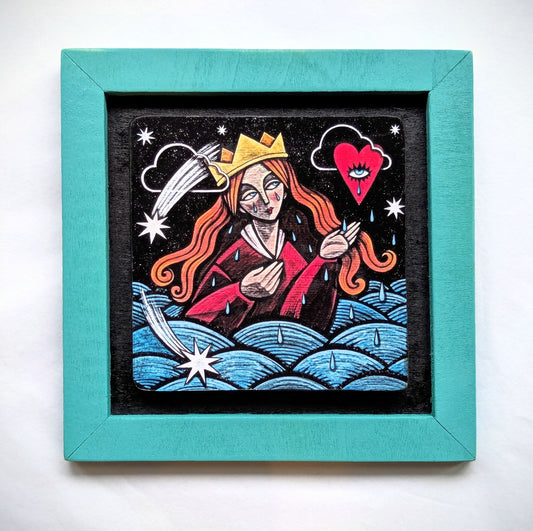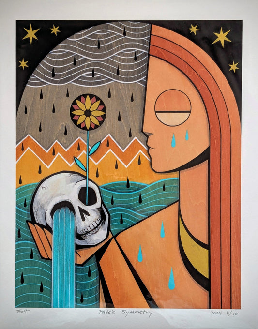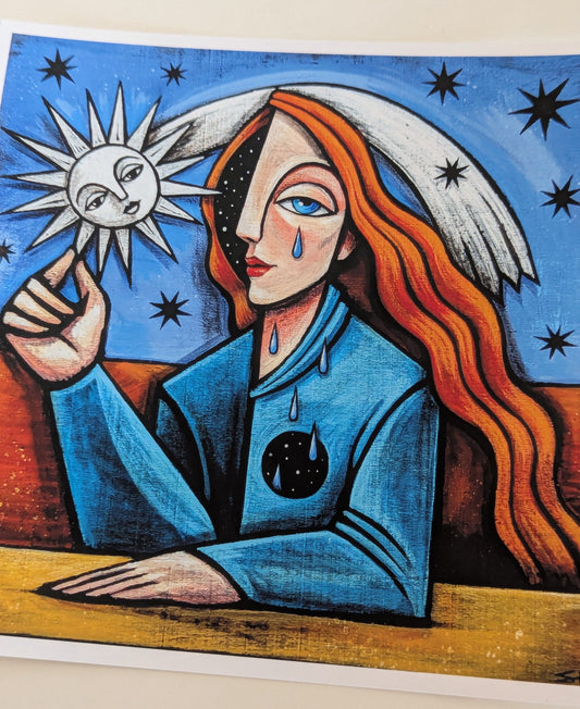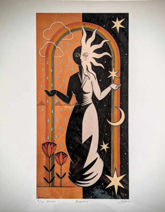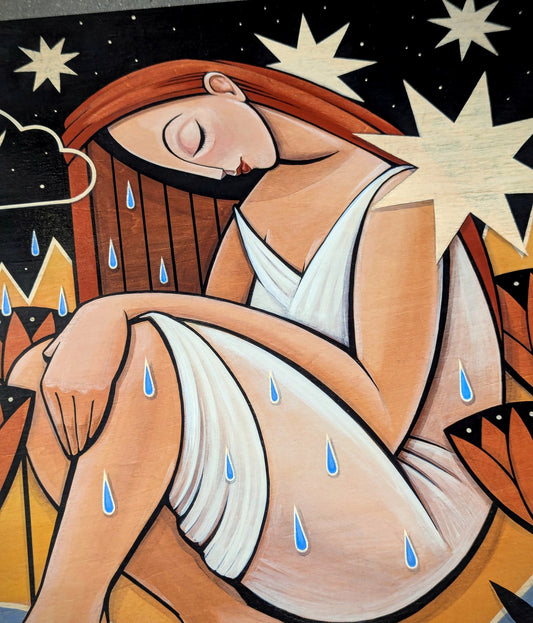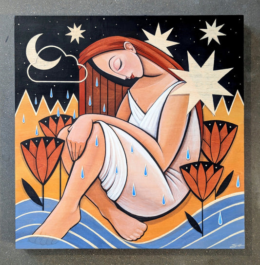 Saira's art is a graphic blend of surrealism, cubism and art deco with a southwest folk-pop flare. Her painting process is as distinctive as her style, as she works with watered-down acrylic directly on raw wood, allowing the natural grain to show through. Her paintings beautifully depict strong female imagery set against cosmic backdrops adorned with symbols and myth.