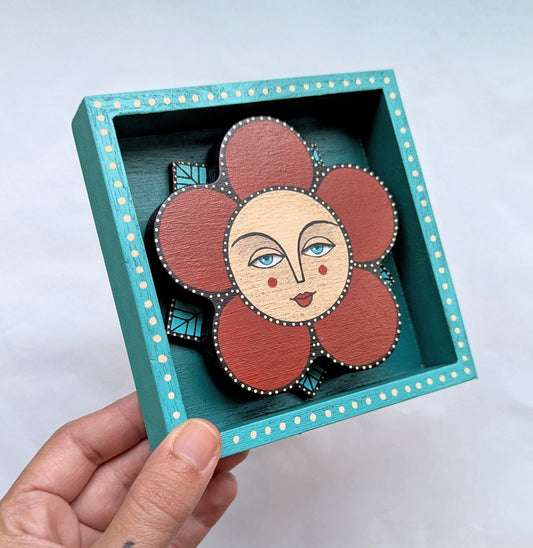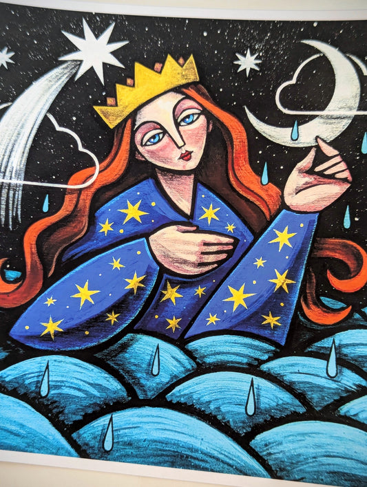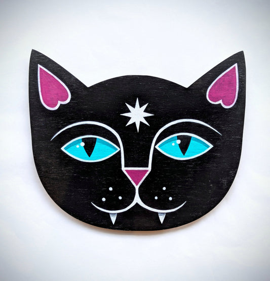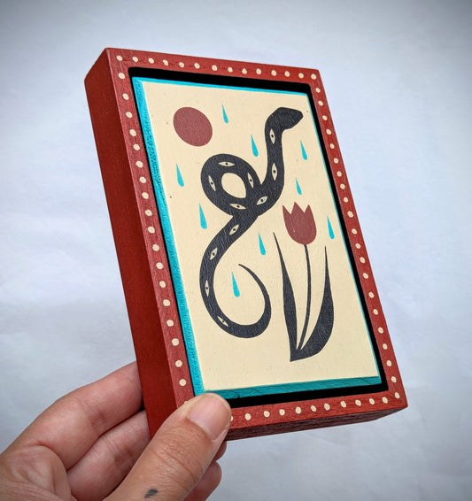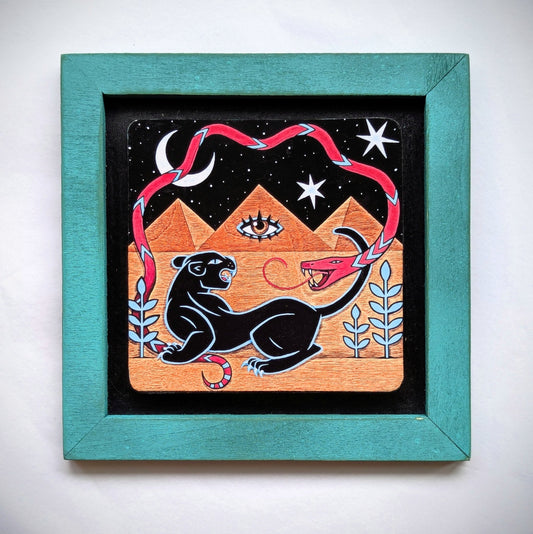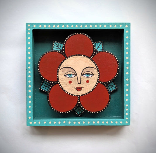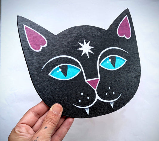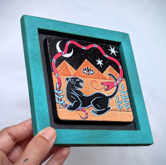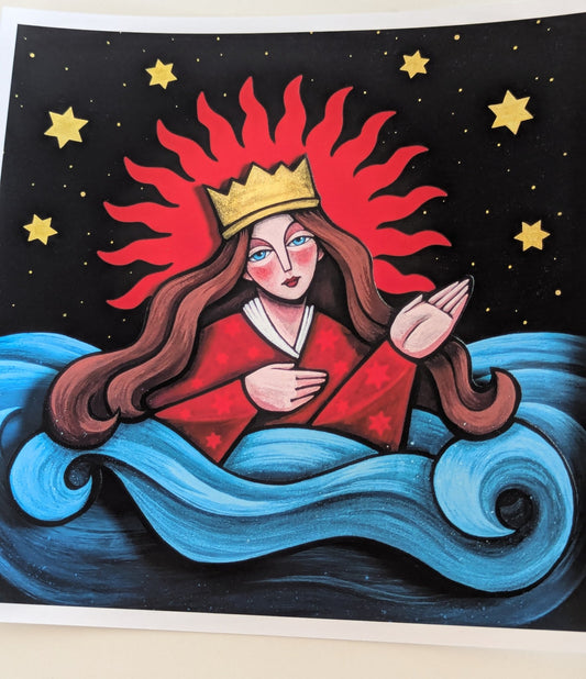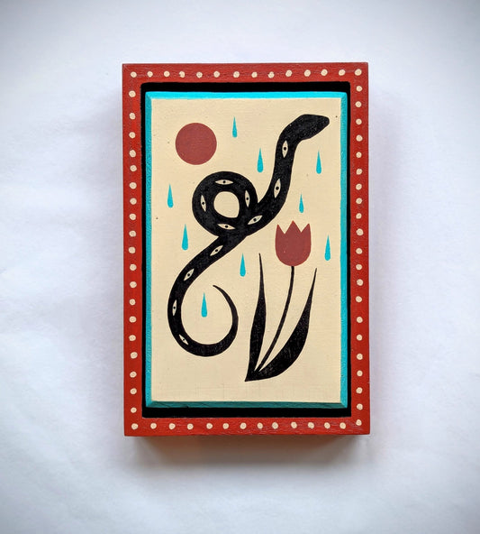 Saira's art is a graphic blend of surrealism, cubism and art deco with a southwest folk-pop flare. Her painting process is as distinctive as her style, as she works with watered-down acrylic directly on raw wood, allowing the natural grain to show through. Her paintings beautifully depict strong female imagery set against cosmic backdrops adorned with symbols and myth.