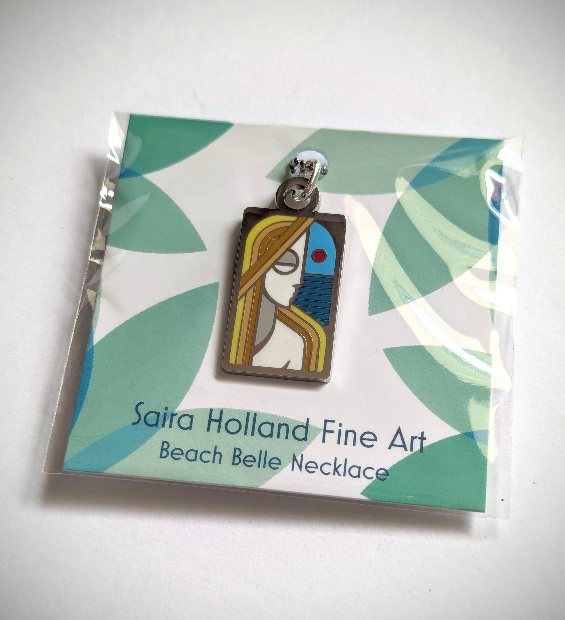 Beach Belle hard enamel pendant on an 18" stainless ball chain with claw clasp designed by Saira Holland