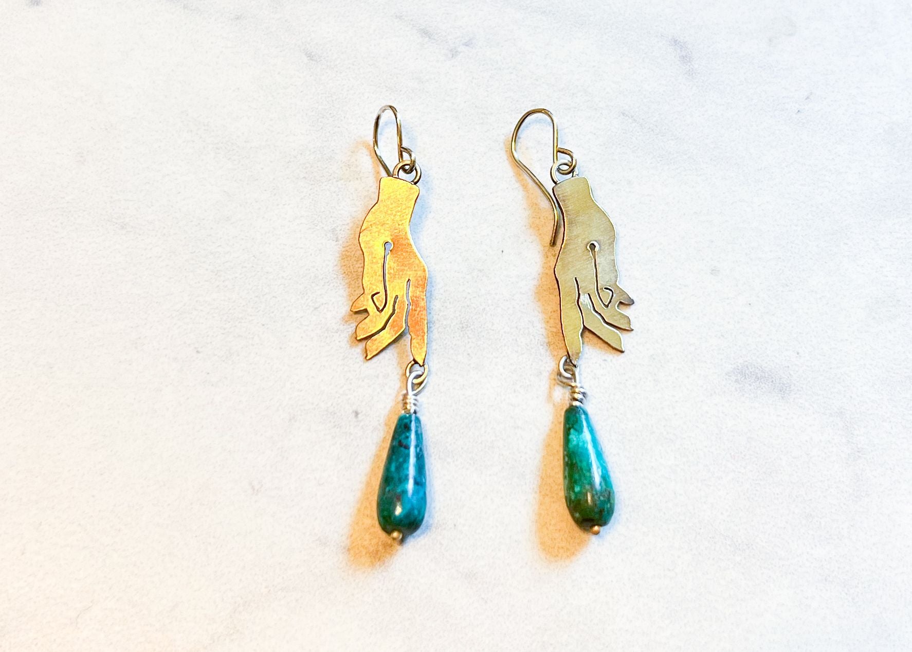These earrings were handmade in brass with sterling silver ear wires and Amethyst and Turquoise dangles.