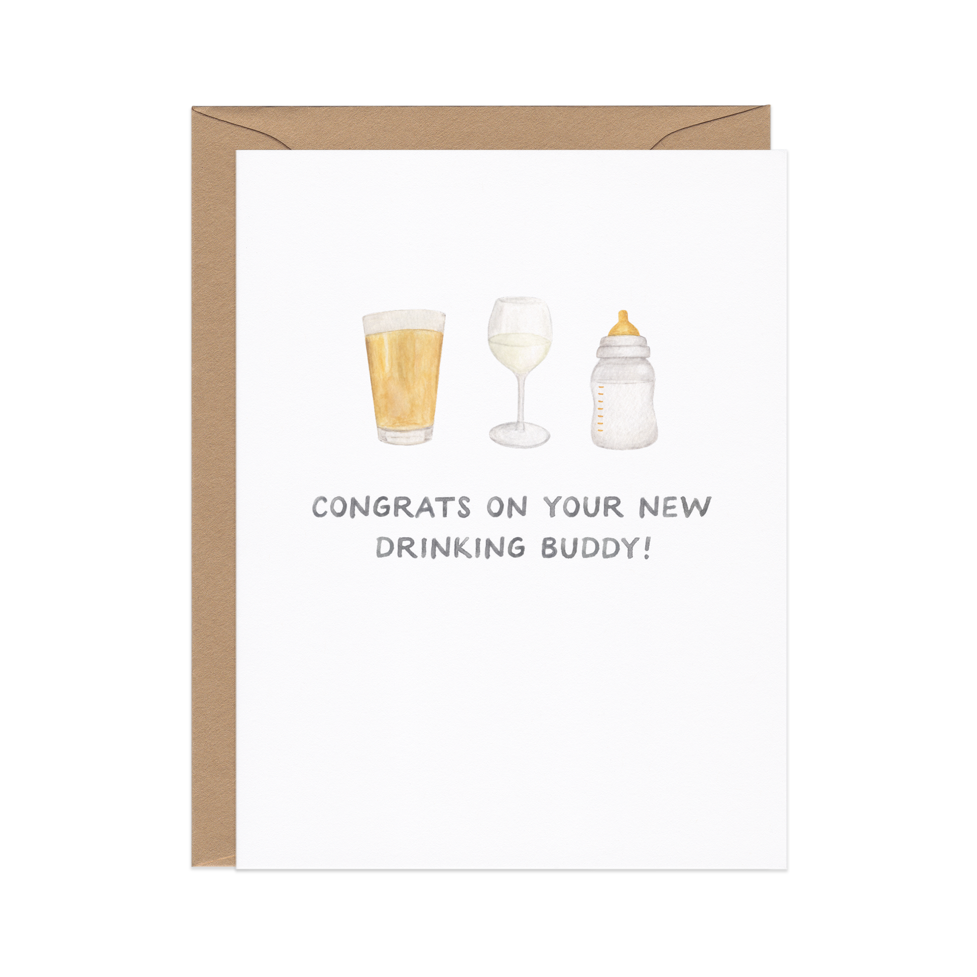 This gender neutral baby card features a little something for dad, mom, and baby. Paired with a playful, boozy pun! Great for: new baby, new parents, baby showers, pregnancy, beer lovers, wine lovers