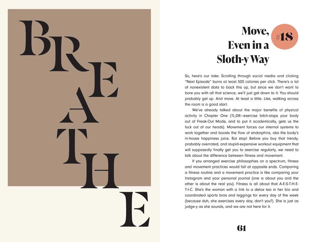 Divided into six chapters—the first two will help kick that anxiety spiral in it's scrawny ass, and the next four help build and flex anti-anxiety powers on the daily—F*ck Anxiety covers the following: