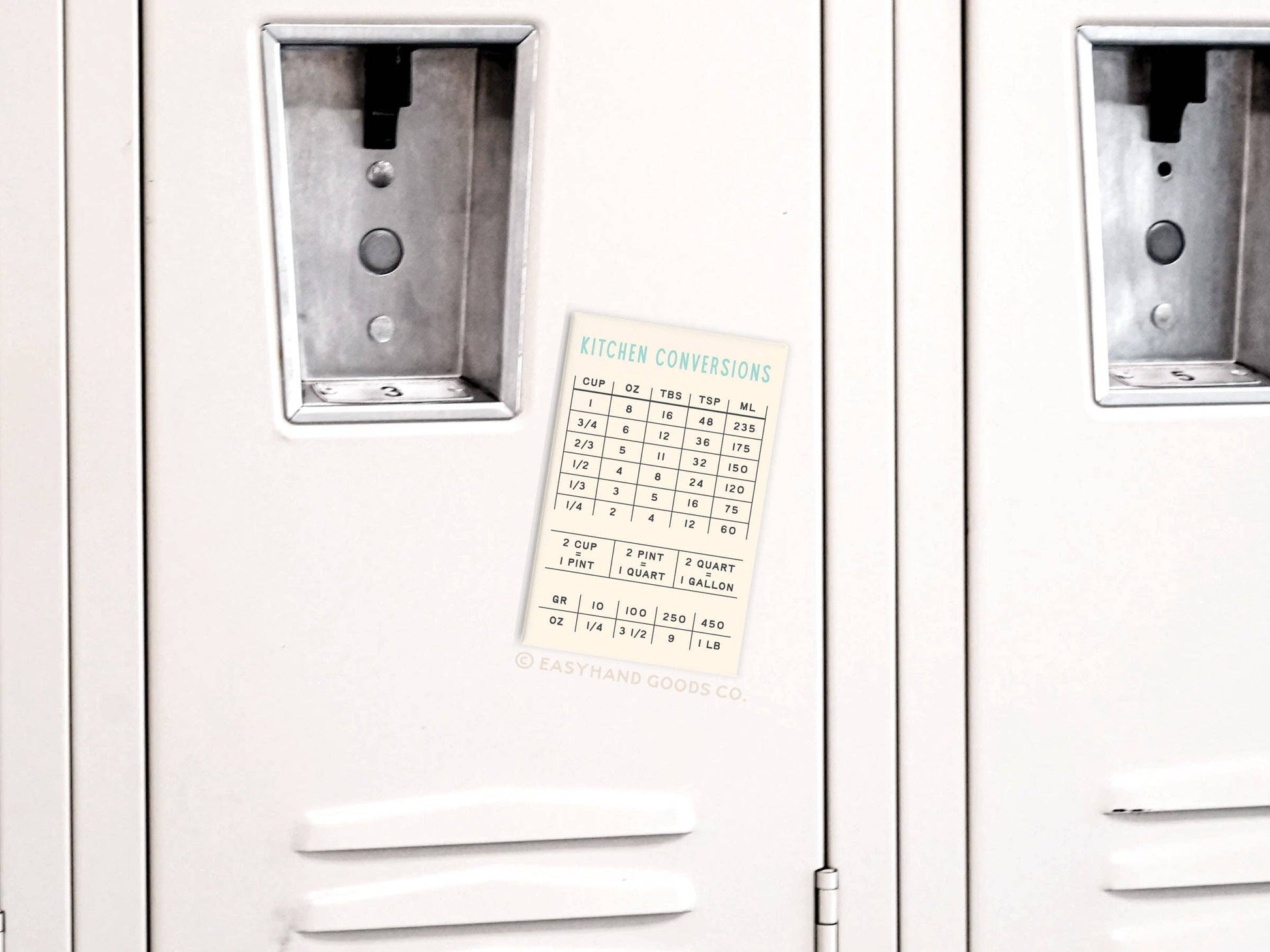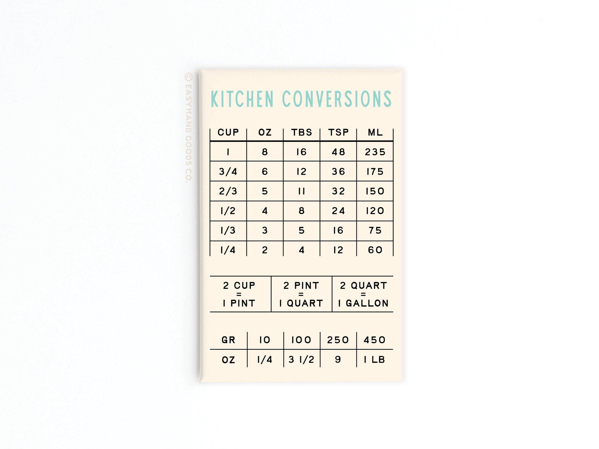 Make your cooking endeavors a breeze with our Kitchen Conversions Refrigerator Magnet. This handy and informative magnet provides quick and easy access to essential kitchen conversion measurements, ensuring your recipes are always perfectly proportioned. Refrigerator Magnet Details: Size: 2" x 3" rectangular magnet. Material: Metal shell with flat, magnetic backing. Front of magnet is covered with clear protective mylar. Print Quality: Features vibrantly printed colors that pop, ensuring the design is eye-catching and clear. Packaging: This item comes unpackaged, making it easy to immediately display. Origin: Proudly printed in the USA and hand-assembled in our studio ensuring high-quality production.