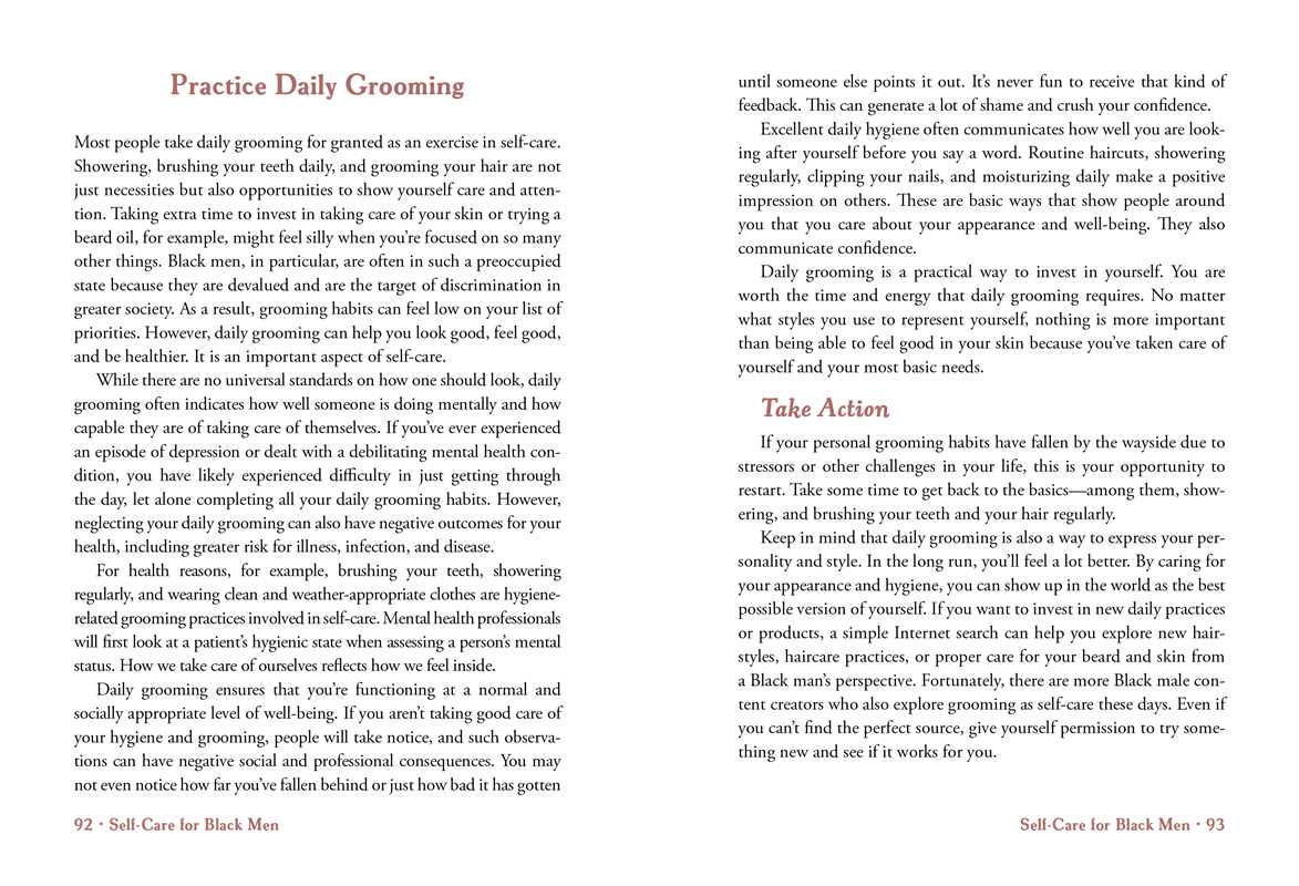 In Self-Care for Black Men, you will find practical answers to your questions. This book contains self-care strategies that address some of the most common issues Black men face, such