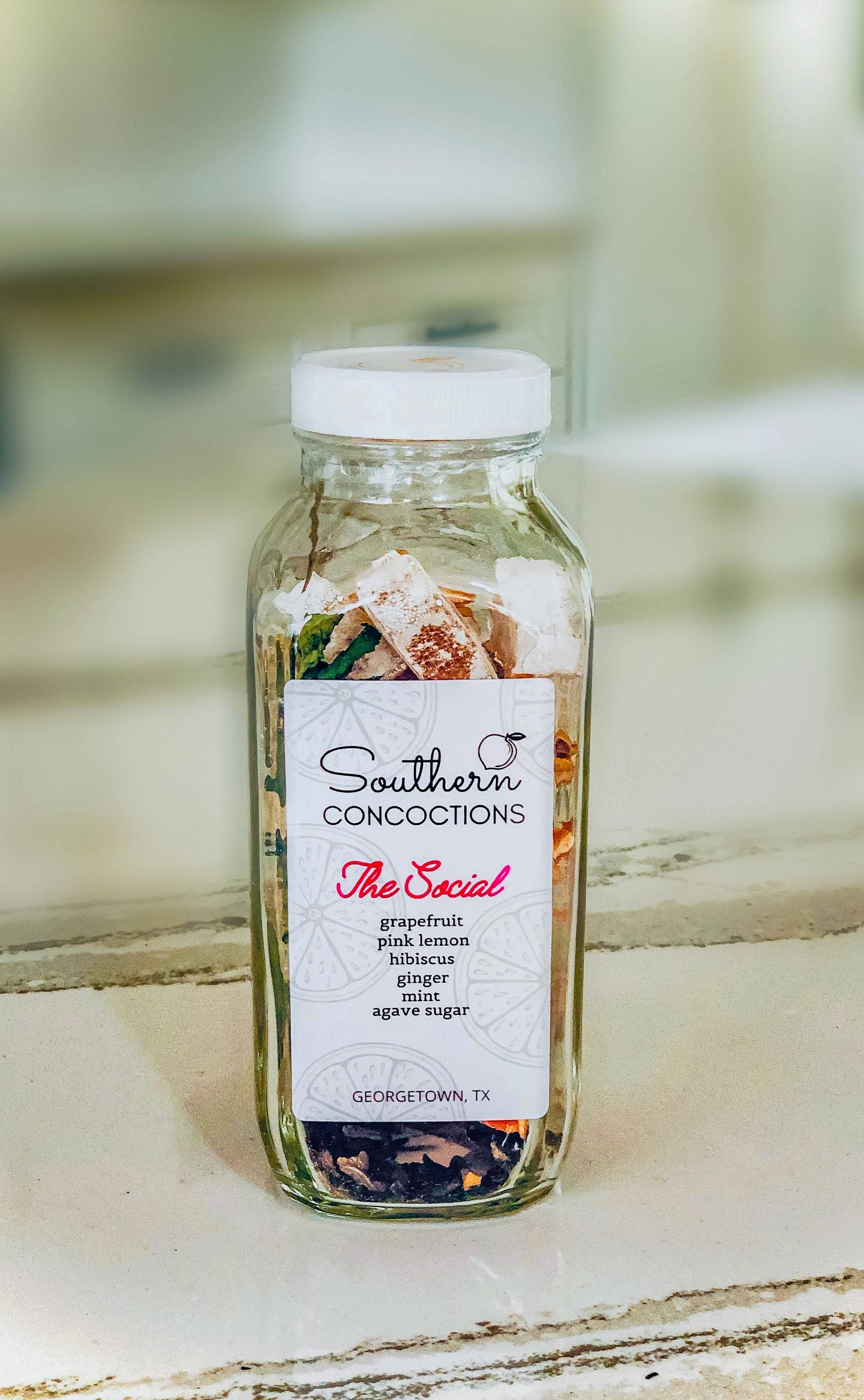 Grab your friends and a patio while sippin' on The Social! It's made up of grapefruit, pink lemons, hibiscus, ginger, mint, and our Texas Agave Sugar. Each jar serves 8 drinks and can be infused TWICE!