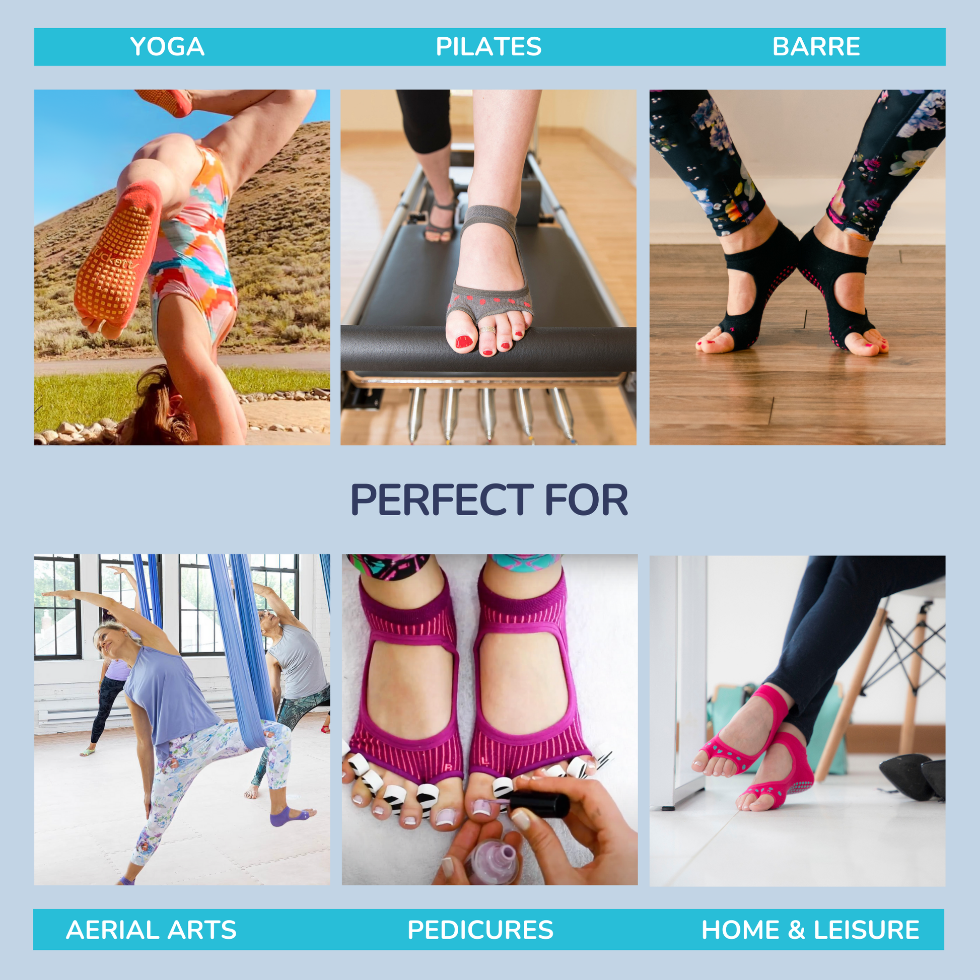 Tucketts™ toe-free style allows your toes to retain all sensation and engage your mind/body connection. Your toes have the freedom to make balance adjustments, while our grips and elastic trim keep you feeling confident and stable. We keep your soles clean and dry for a comfortable workout experience.