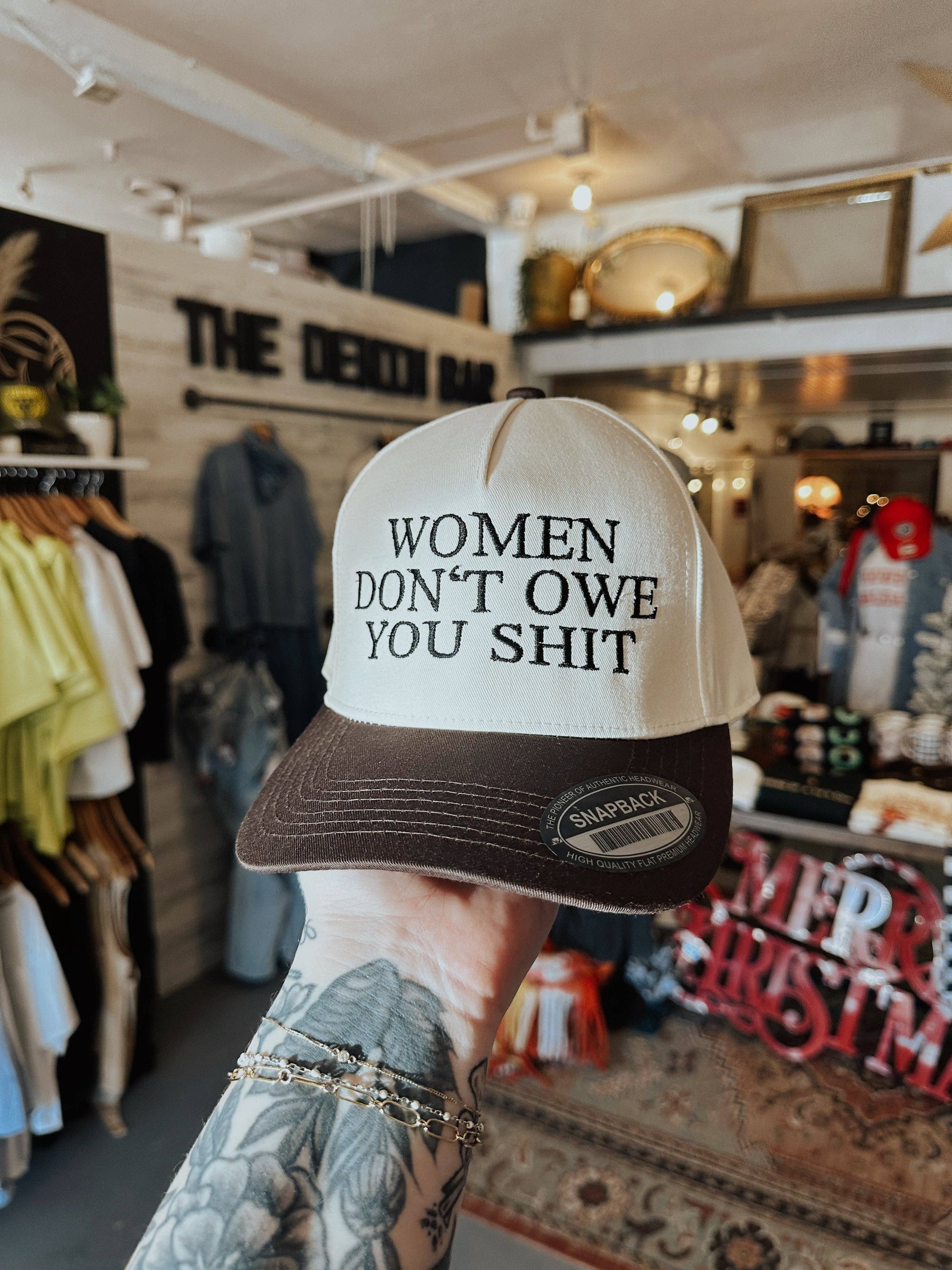 At Grady Ln Boutique, we offer our Women Don’t Owe You Shit Trucker Hat. This unisex trucker hat is made in-house and is more than just an accessory, it's a statement. It embodies our mission for acceptance for all and is a testament to our dedication to creating custom pieces that ignite the badass in all of us.