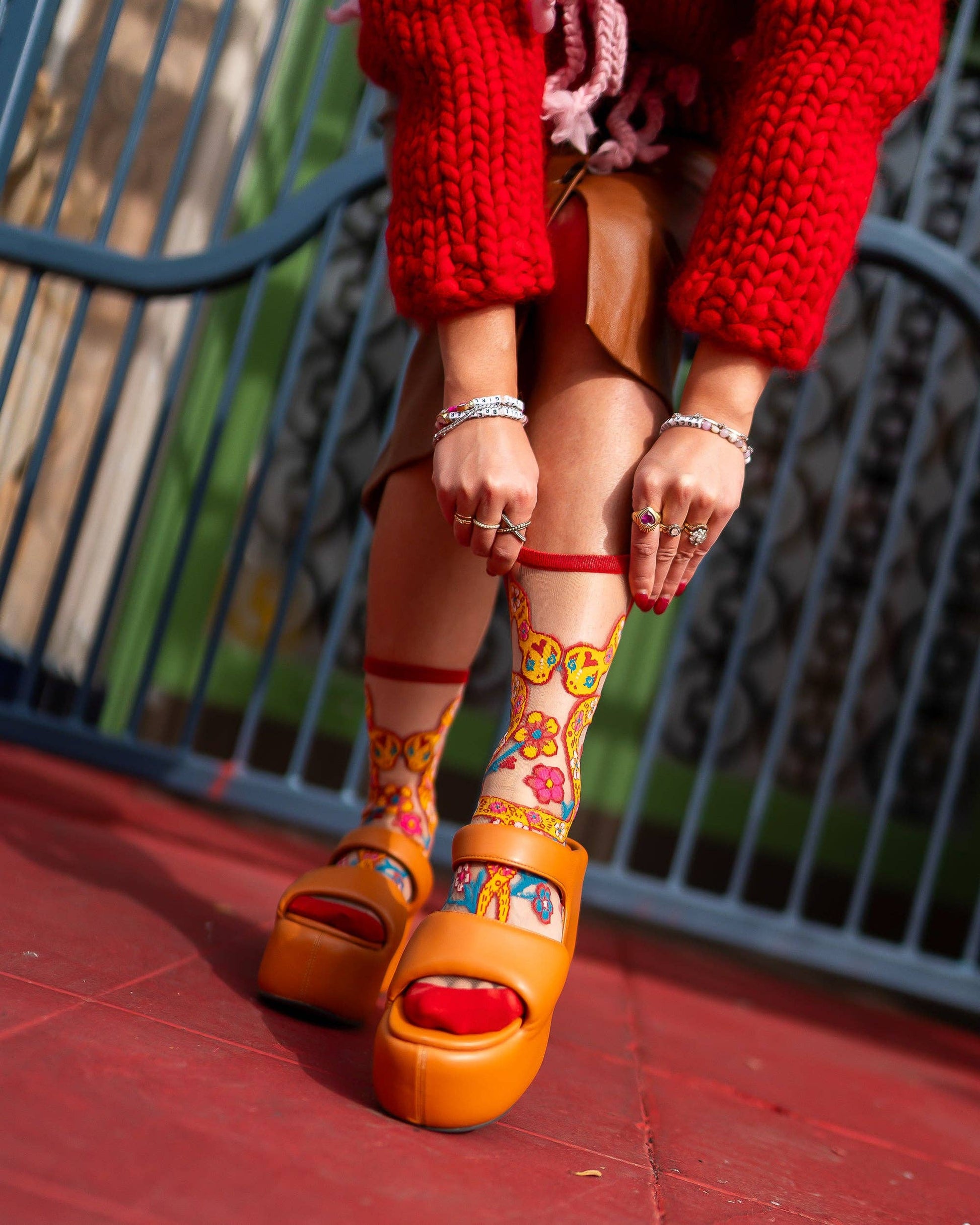 Celebrate Lunar New Year 2025 with our festive Year of the Snake sheer sock. Featuring two yellow snakes with floral patterns in red and turquoise, intertwined to form an abstract heart shape and surrounded by turquoise branches and larger flowers. This sock looks just as stunning from the side as it does from the front, making it an unforgettable showstopper. Pair with red heels for the perfect Lunar New Year look.